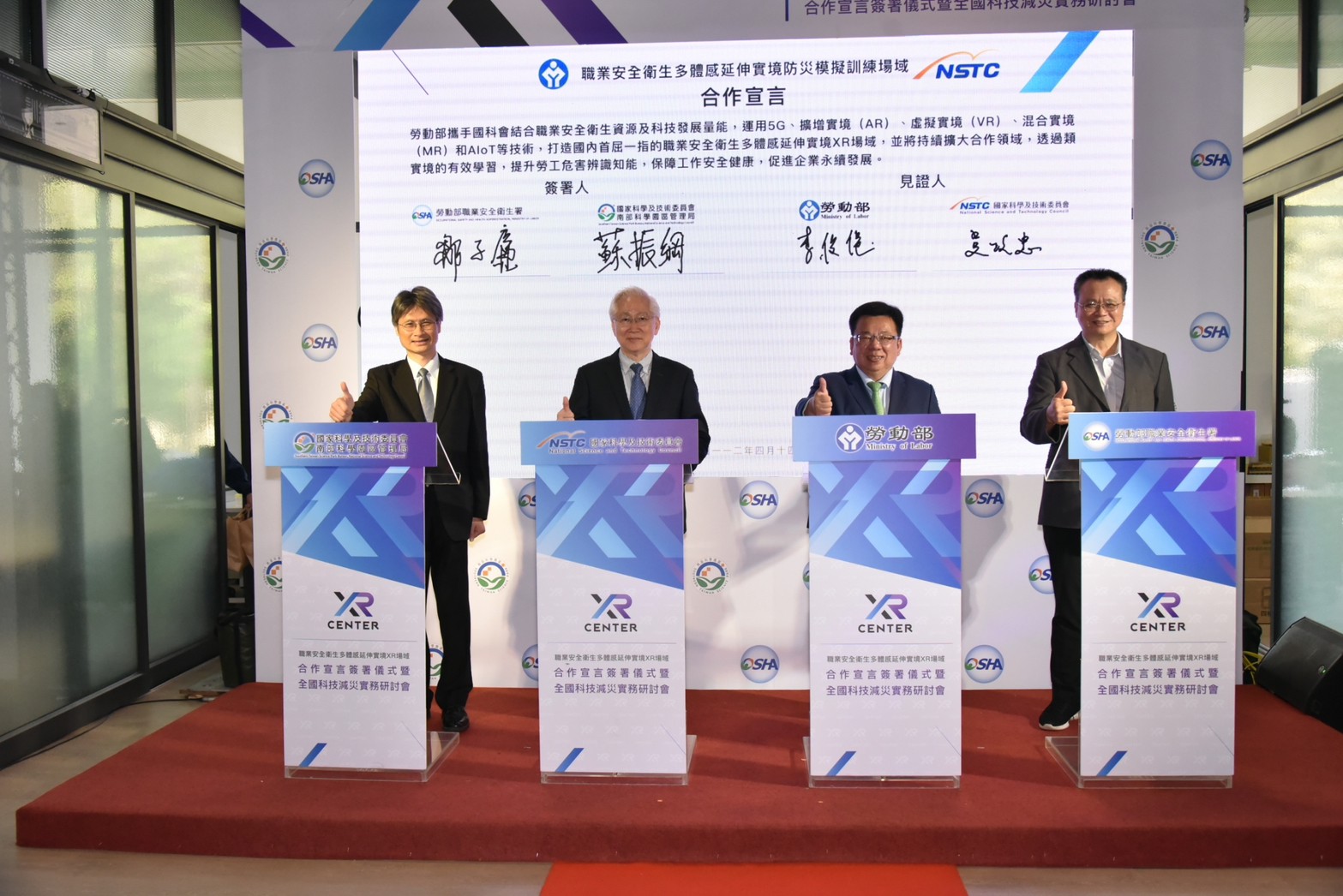勞動部職業安全衛生署及本局於112年4月14日簽署「職業安全衛生多體感延伸實境XR場域」合作宣言。